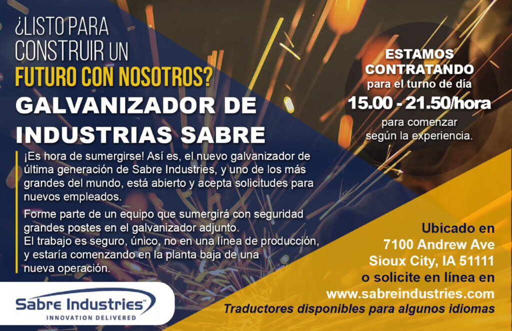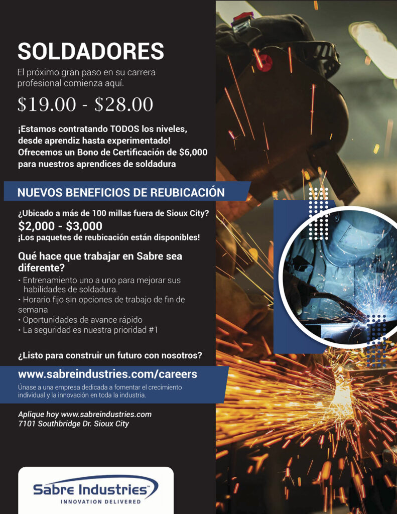 Dave Mathis, soldador/instalador en Sioux City. Antes de llegar a Sabre, Dave pasó aproximadamente 20 años trabajando en varios puestos de contabilidad y comenzó en el Programa de aprendices de soldadura en Sabre hace poco más de dos años. Dave declaró: “Recomendaría el programa de aprendices de soldadura de Sabre a otros por el simple hecho de que los entrenadores convirtieron a una persona como yo, que nunca había hecho este tipo de trabajo, en un soldador bastante bueno. Si alguien quiere trabajar y aprender y ganar buen dinero, definitivamente recomendaría el programa”.